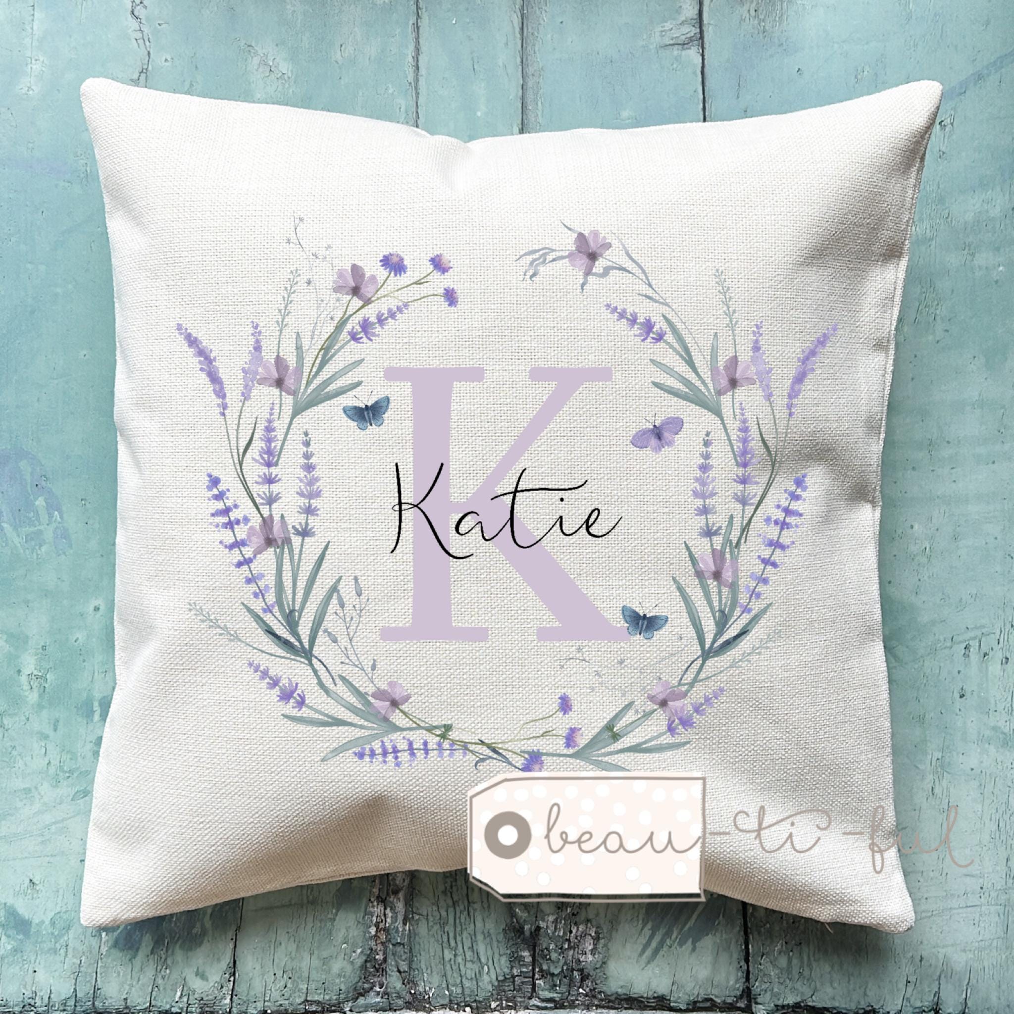 Personalised Name and initial Lilac Wildflower Lavender Floral Design Home Quote Linen Style Cushion cover
