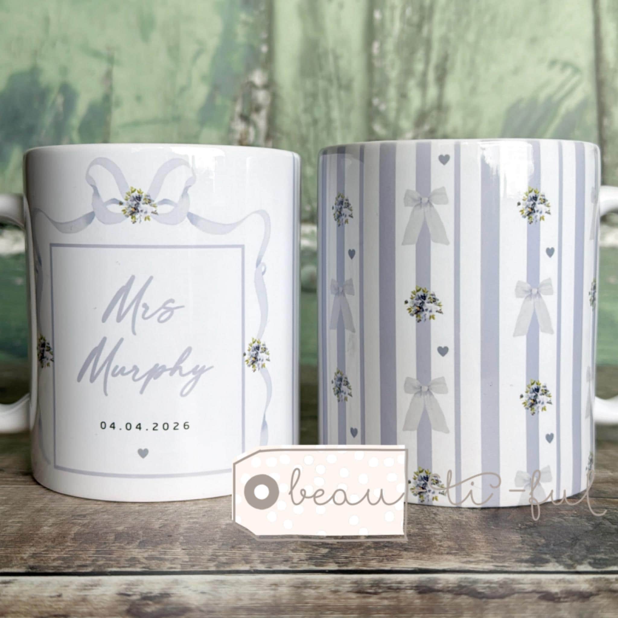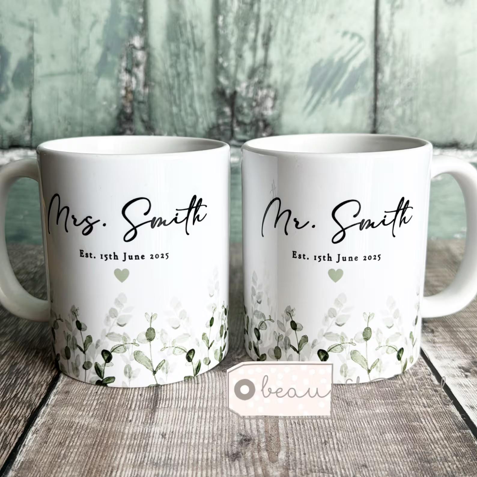Greenery design with quote. Please leave details required. For the 2 mug set you will receive one of each mug eg. Mr and Mrs set, you will receive a Mr mug and a Mrs mug. Mrs and Mrs set you will receive 2 x Mrs mugs etc.