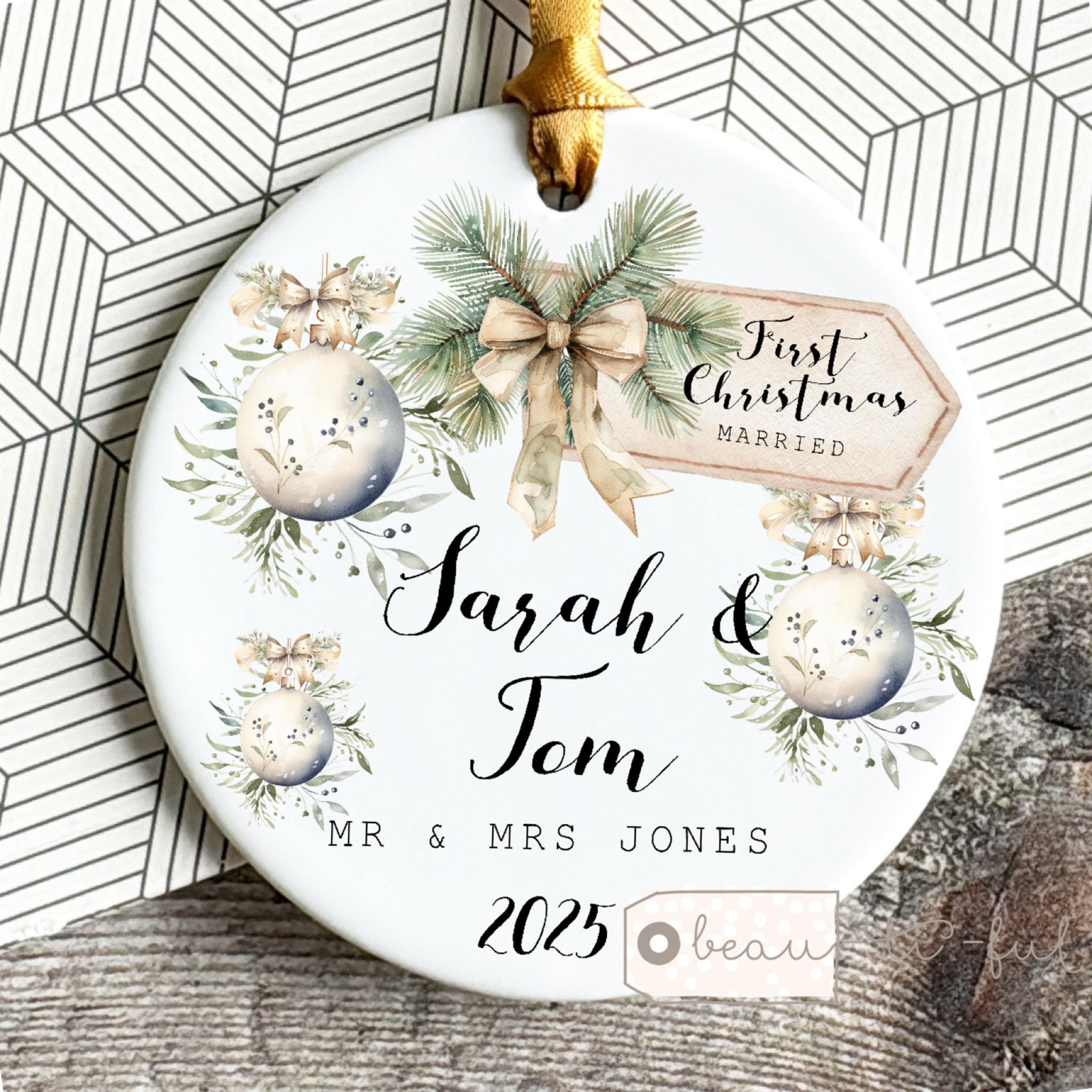 Personalised First Christmas Married Wedding gift Mr Mrs Newlywed Botanical Greenery Design Ceramic or Acrylic Round Ornament Keepsake