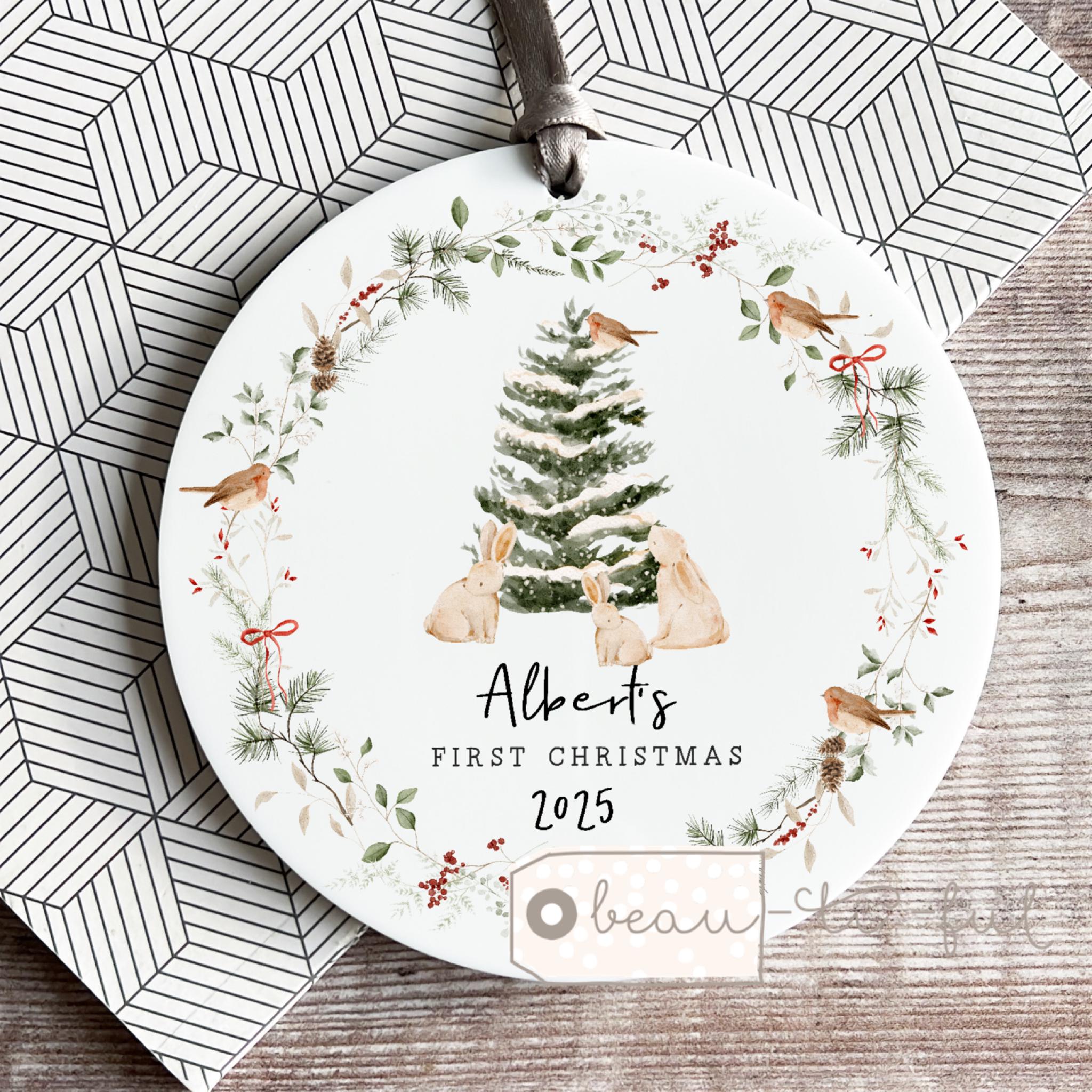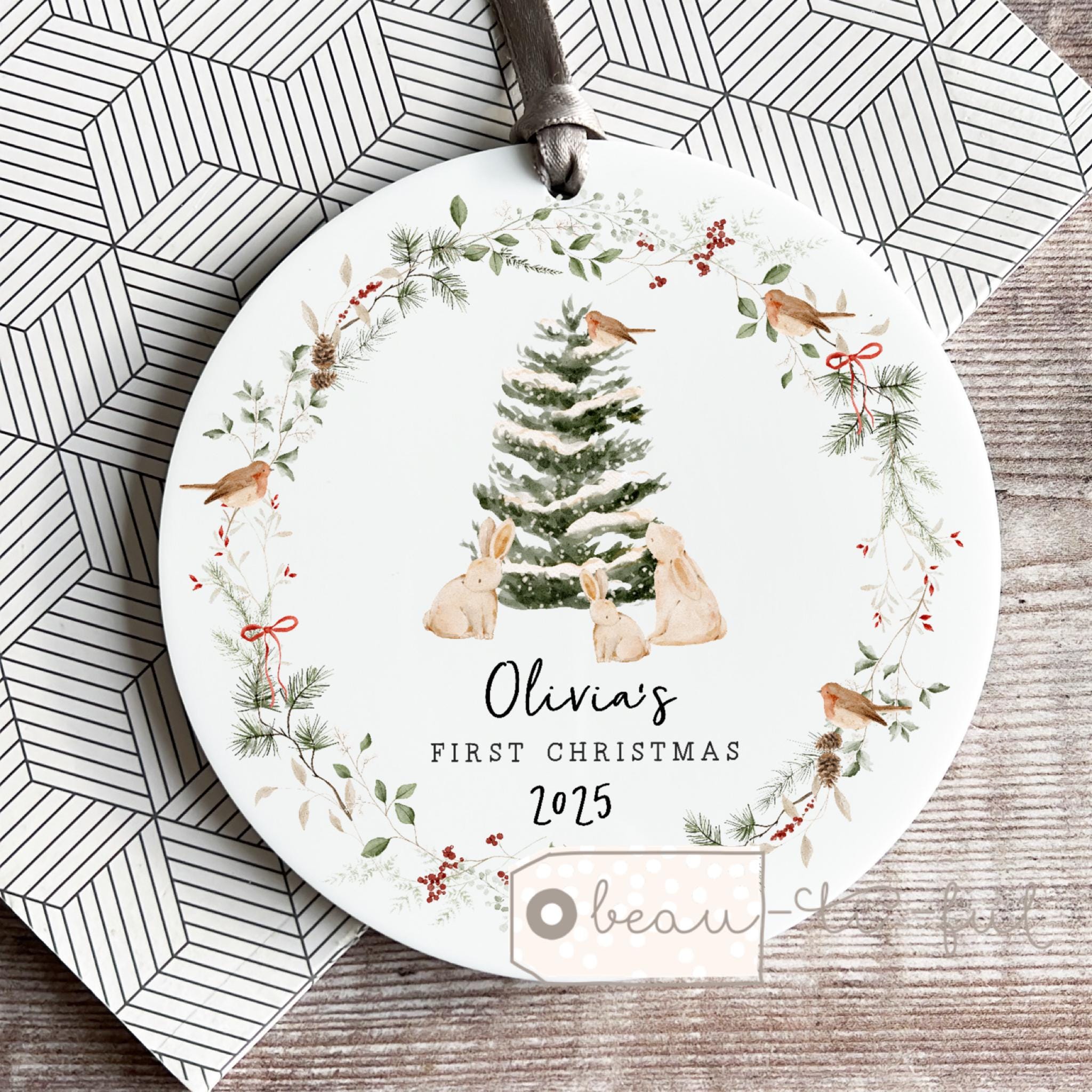 A lovely acrylic or ceramic keepsake ornament. Hung with Ribbon. Ribbon may vary.