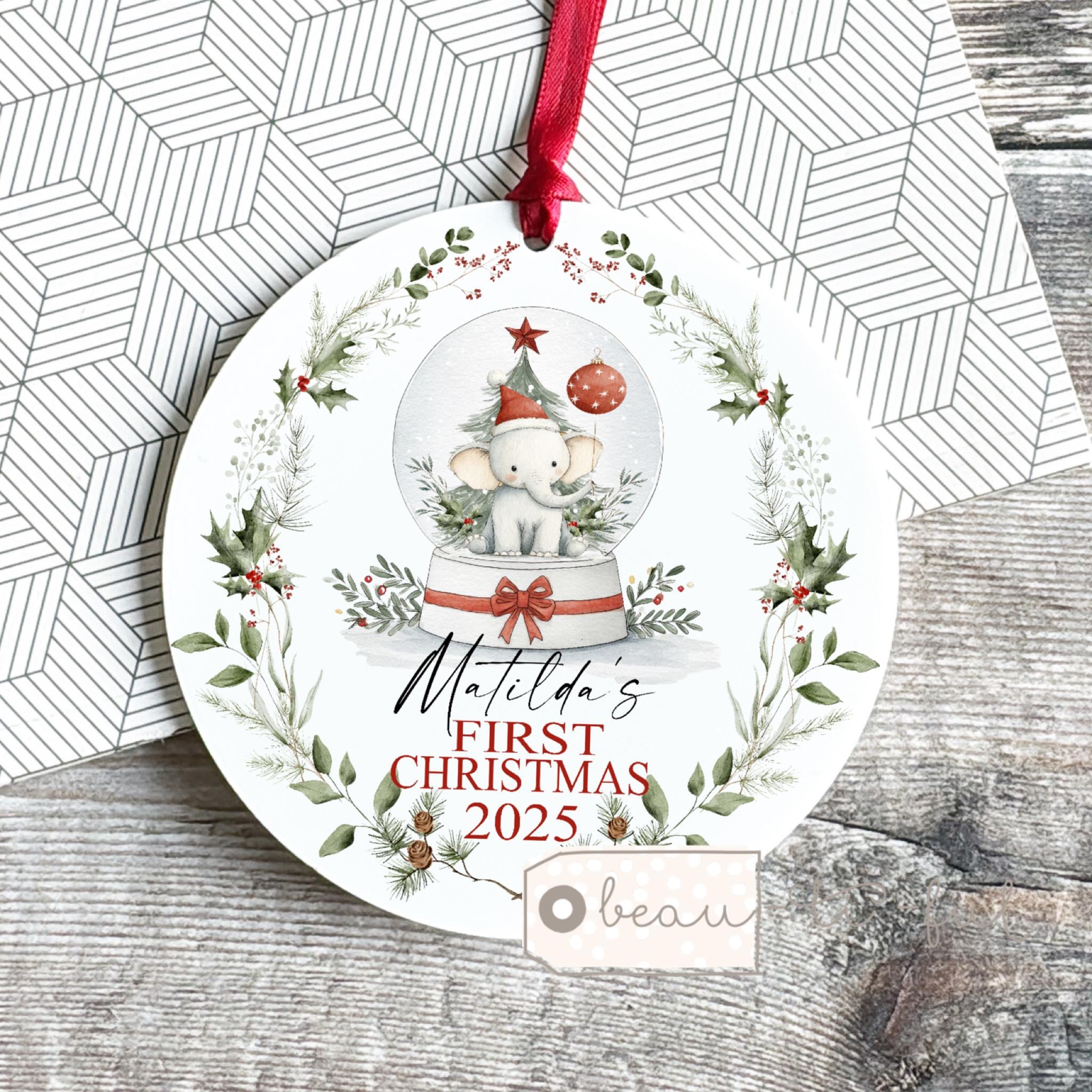 Personalised Baby Babies Baby’s First Christmas Gift Newborn Elephant Santa hat Scene Snowglobe First Bauble Ornament Keepsake New Baby