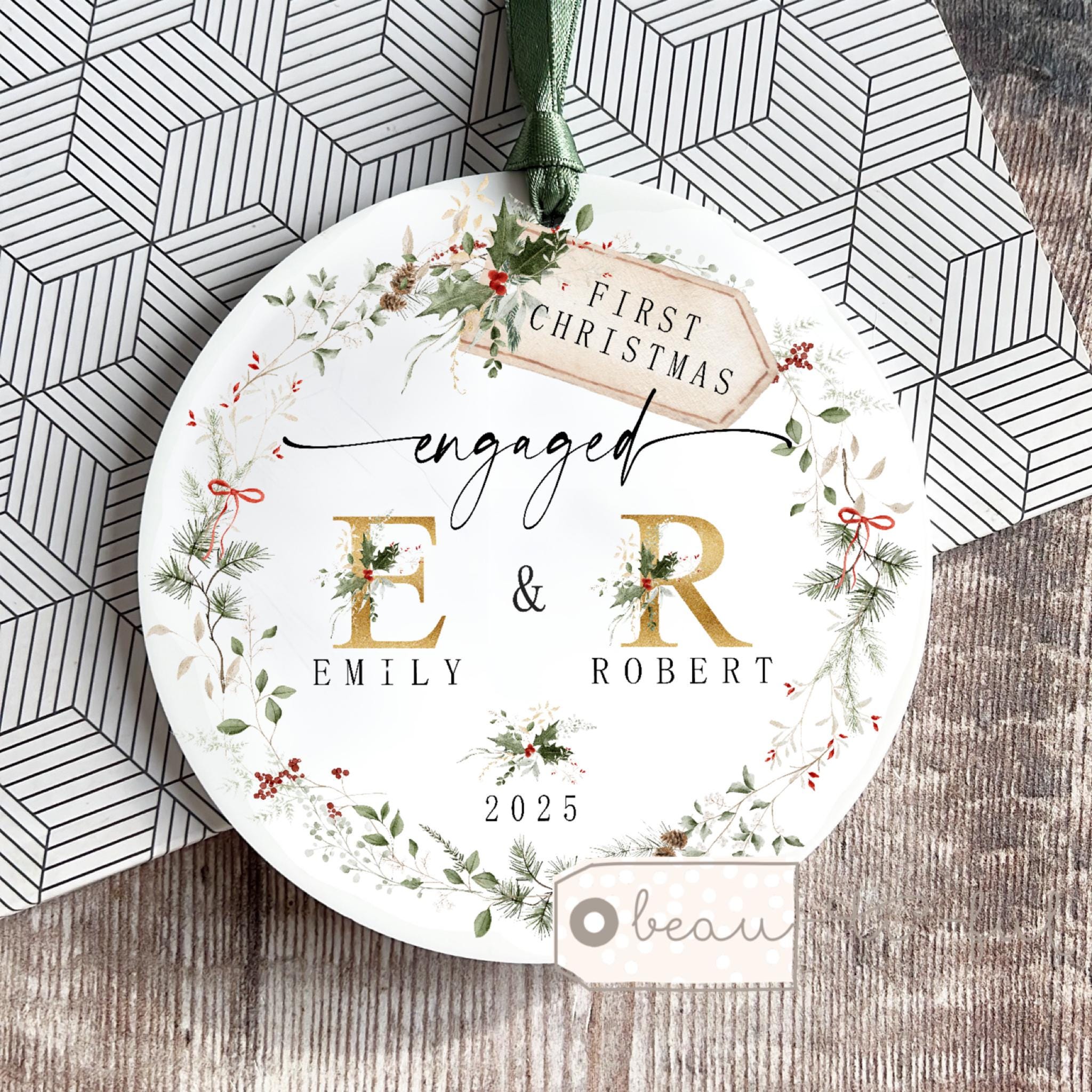 Personalised First Christmas Engaged ornament Together Engagement gift Engaged Anniversary gift wreath Greenery Ornament Keepsake