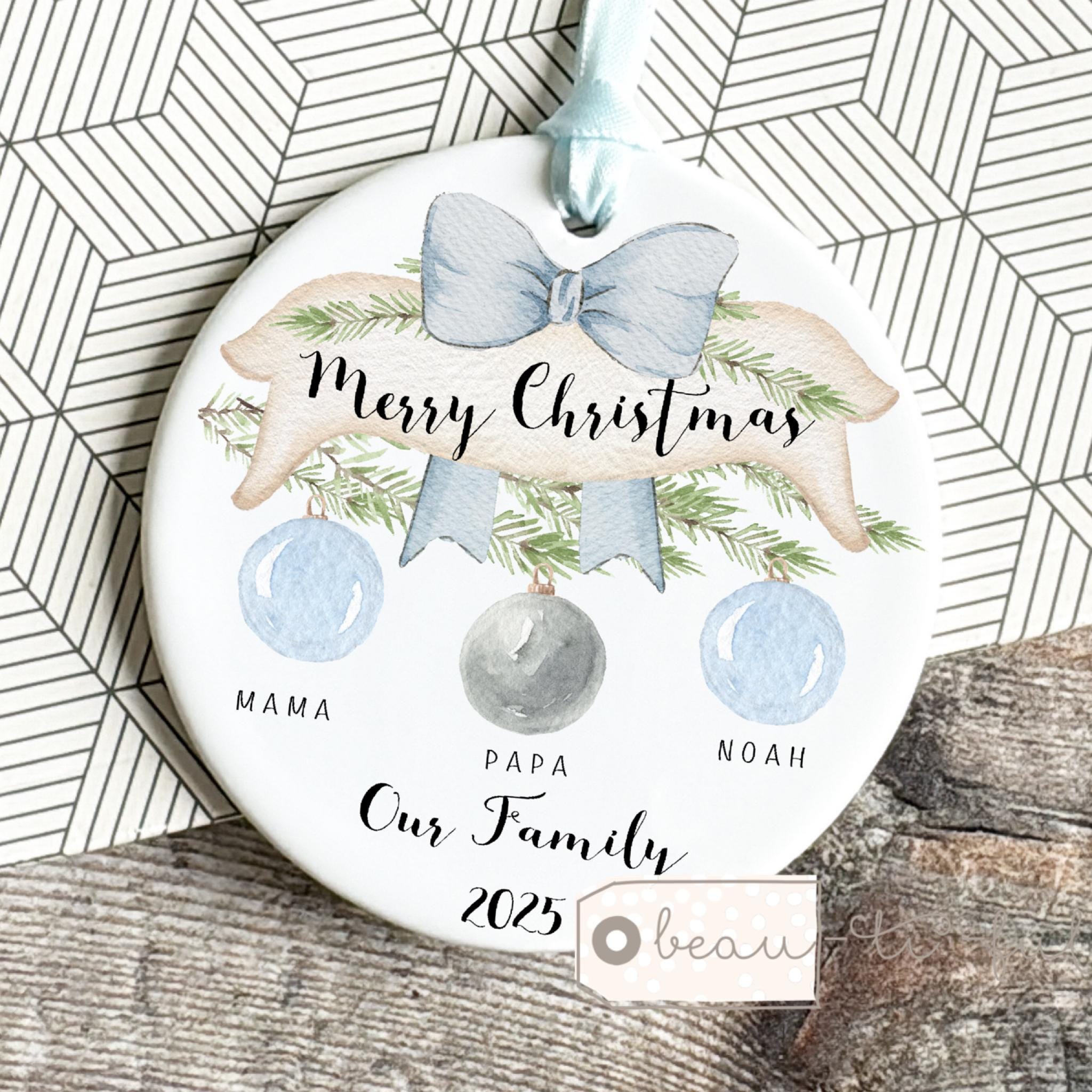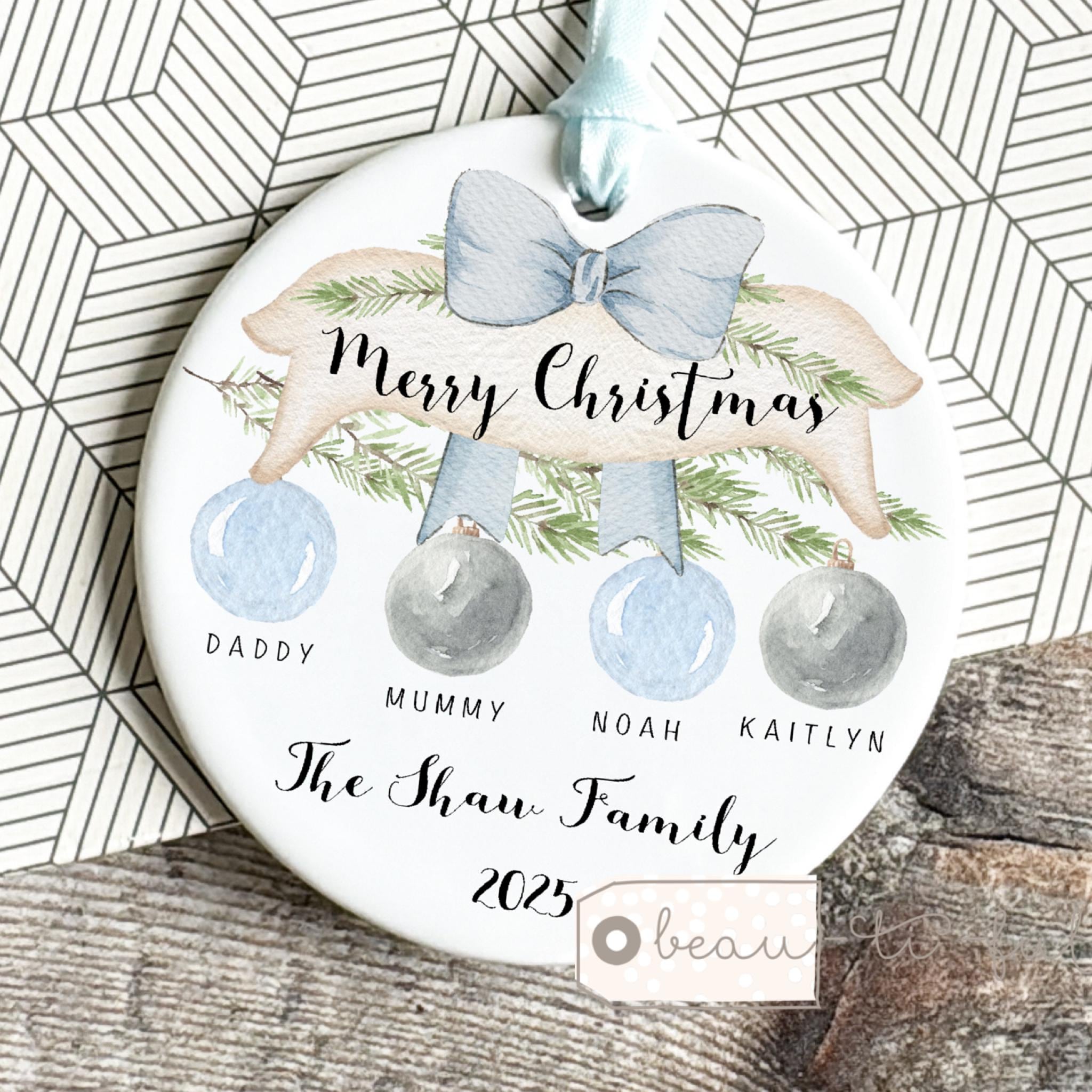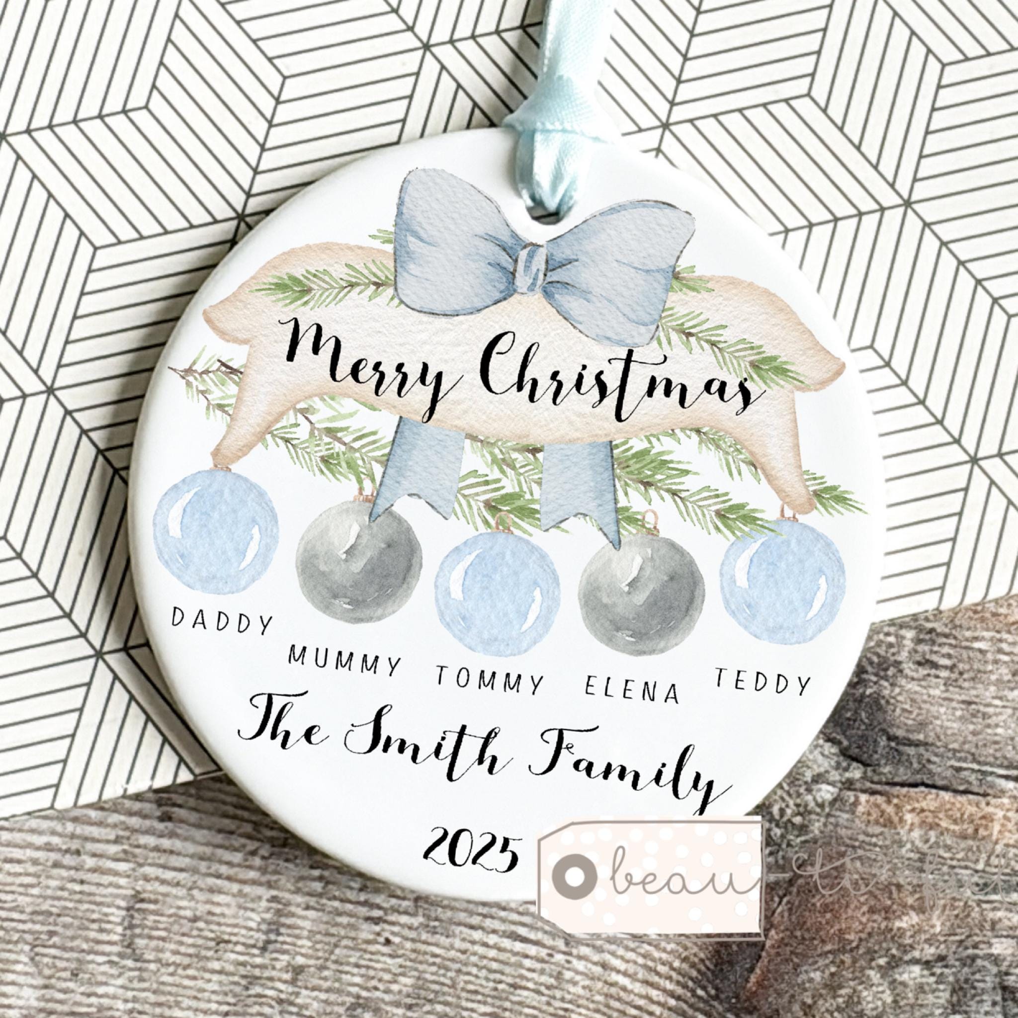 Personalised Family Christmas gift Baubles Greenery Design Acrylic or ceramic Round Ornament Keepsake Tree Bauble decoration gift pale blue