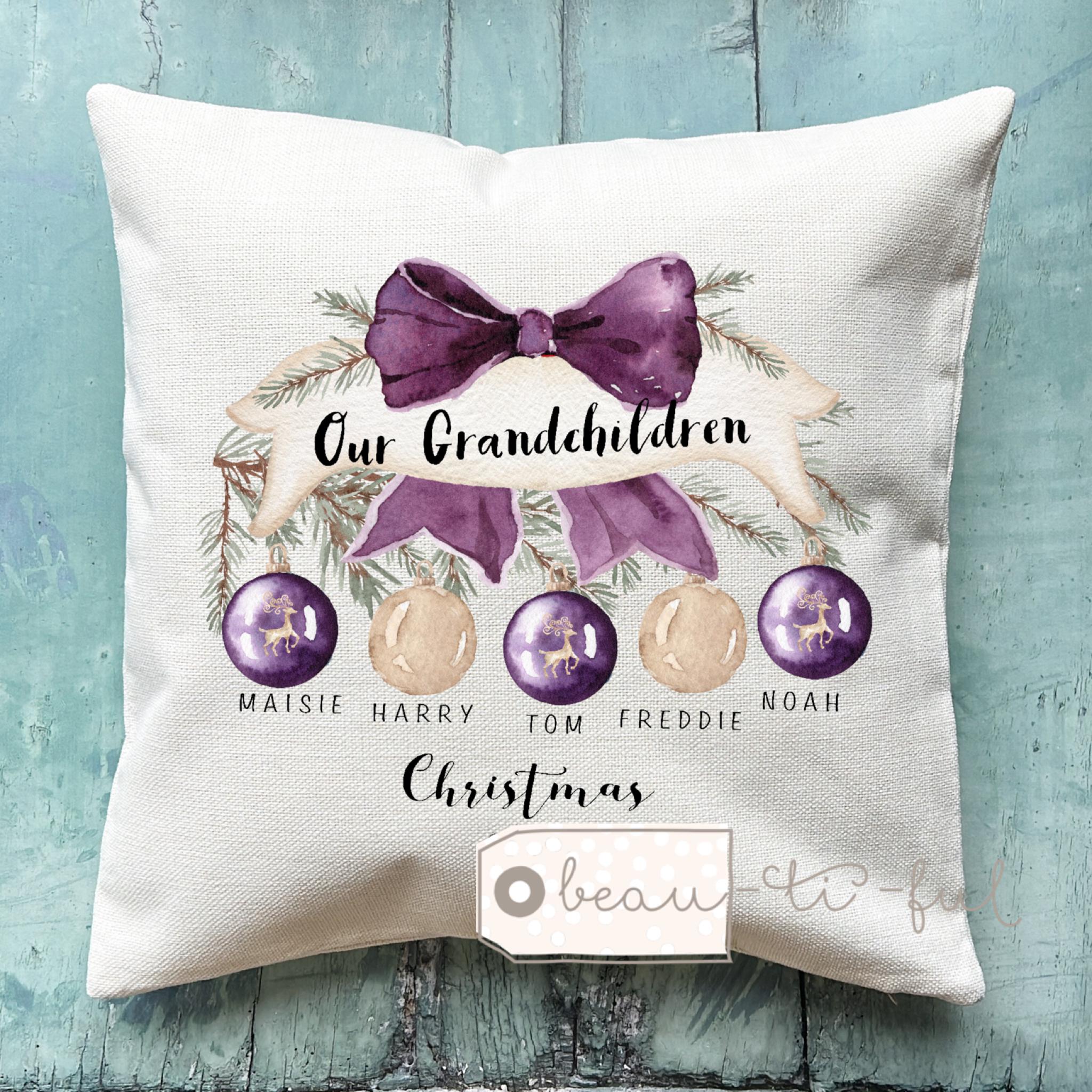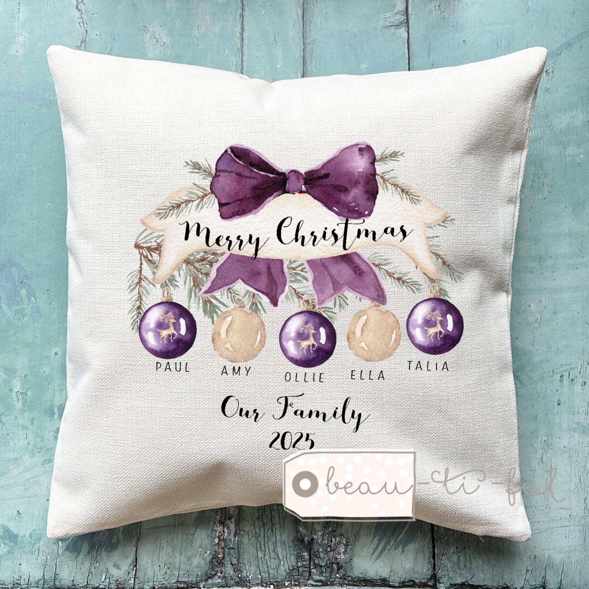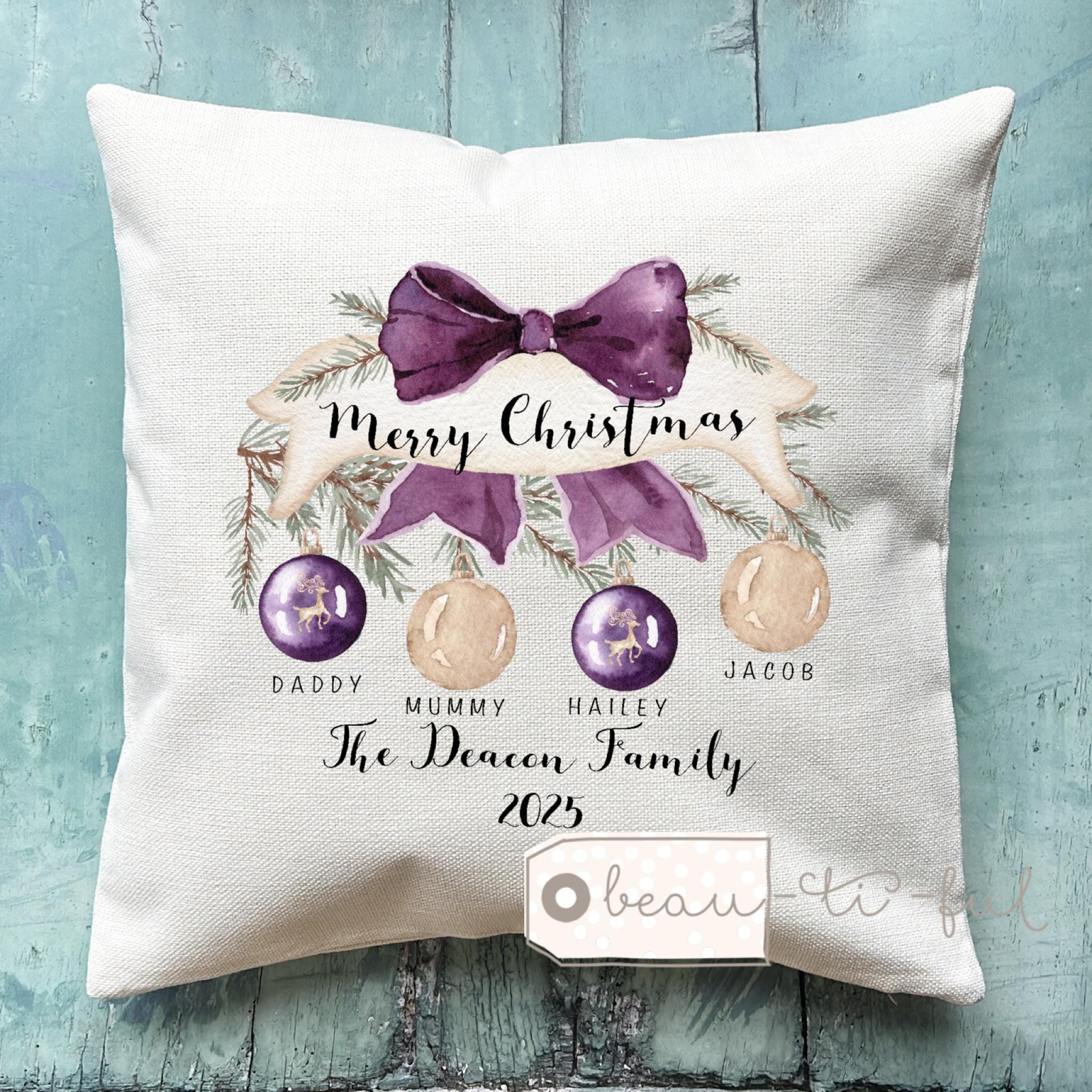 Personalised Christmas Family cushion Wreath Bauble Family gift Foliage Greenery Home Quote Linen Style Cushion cover purple