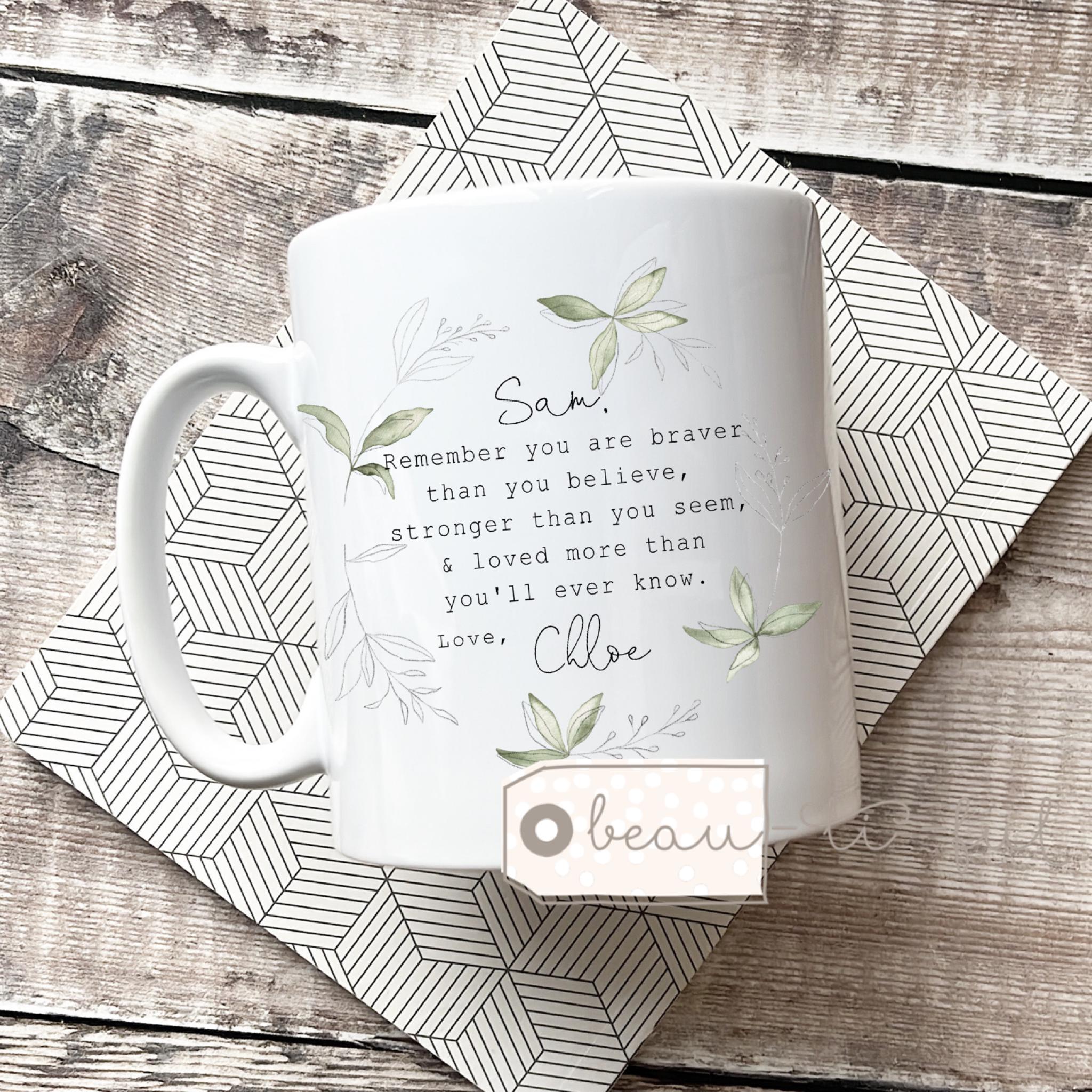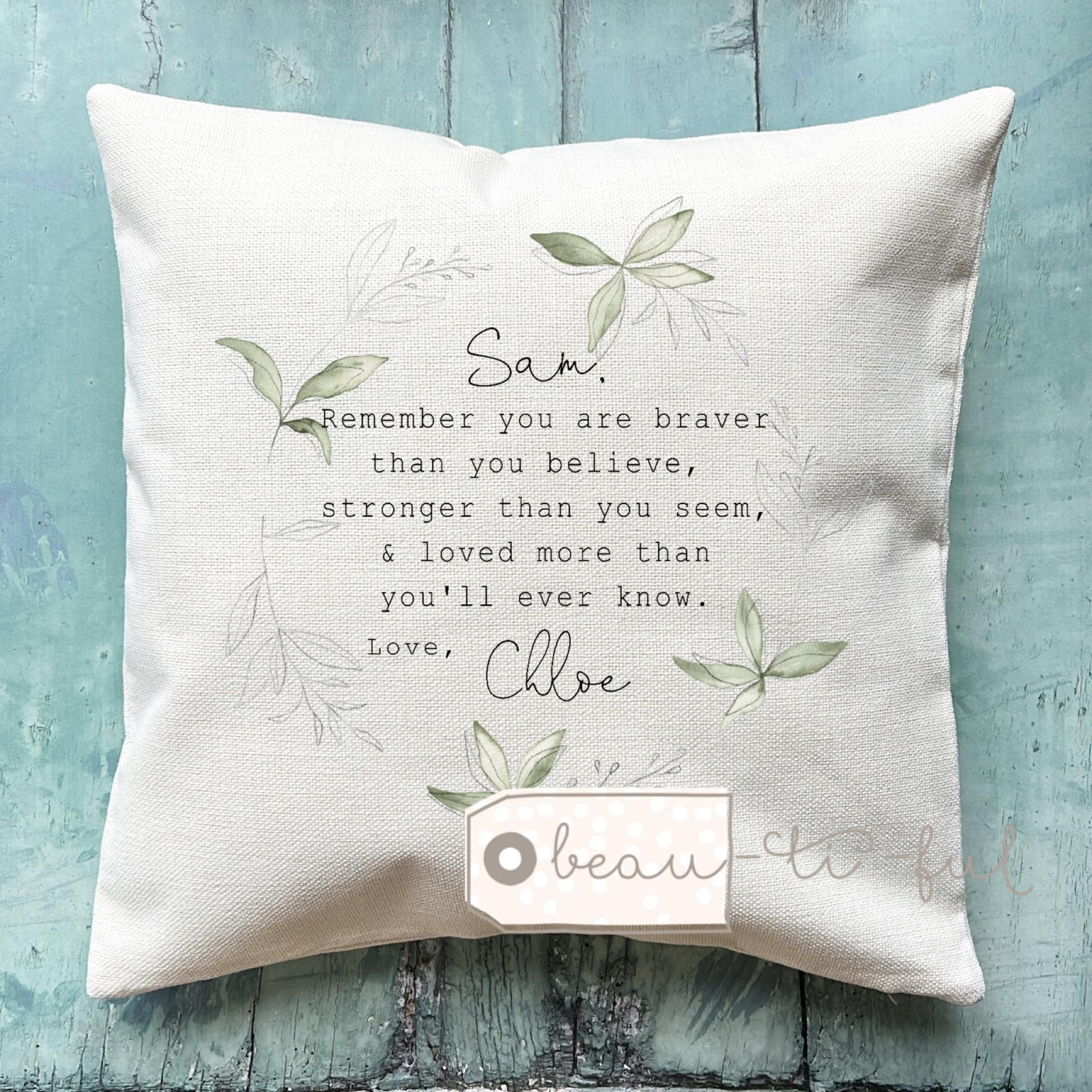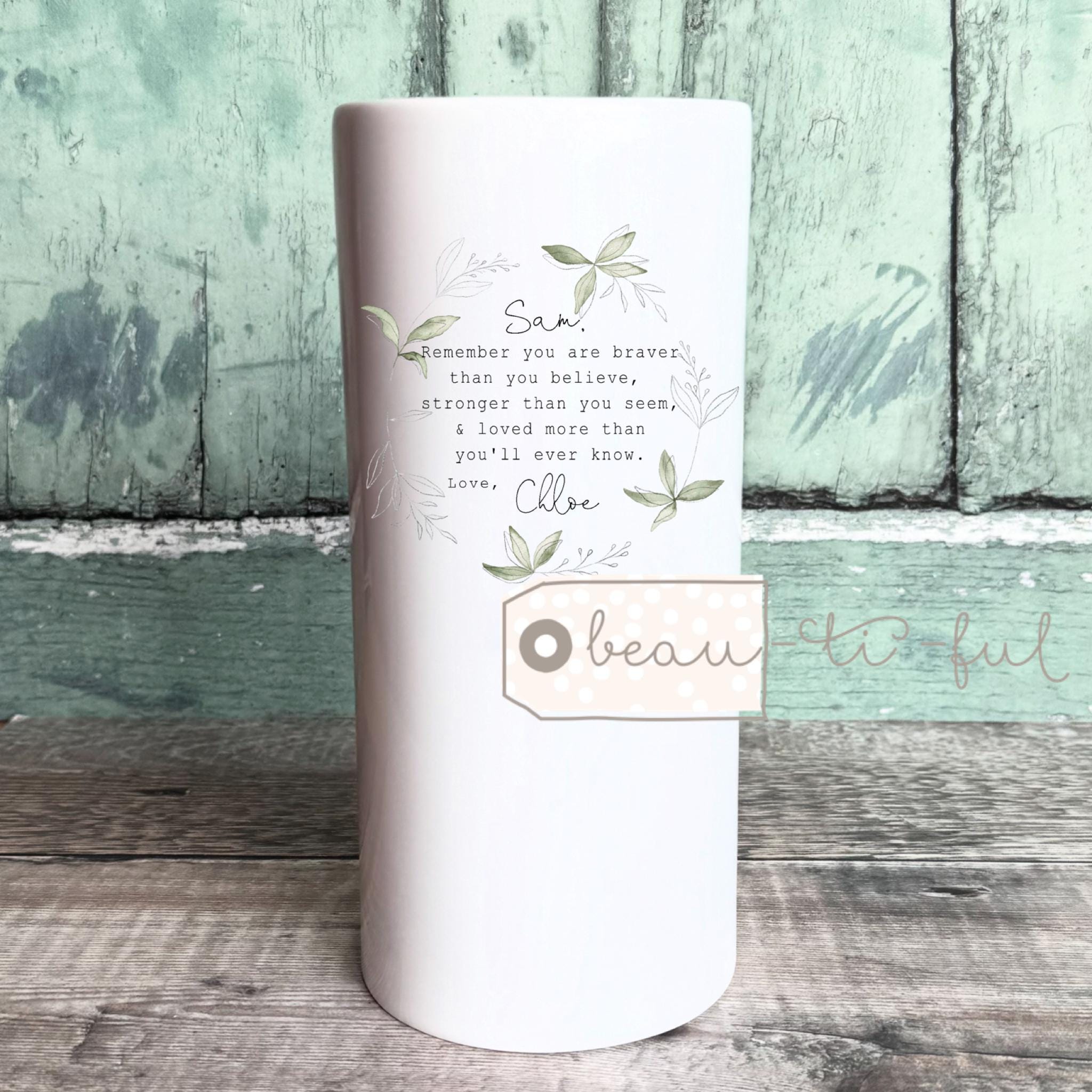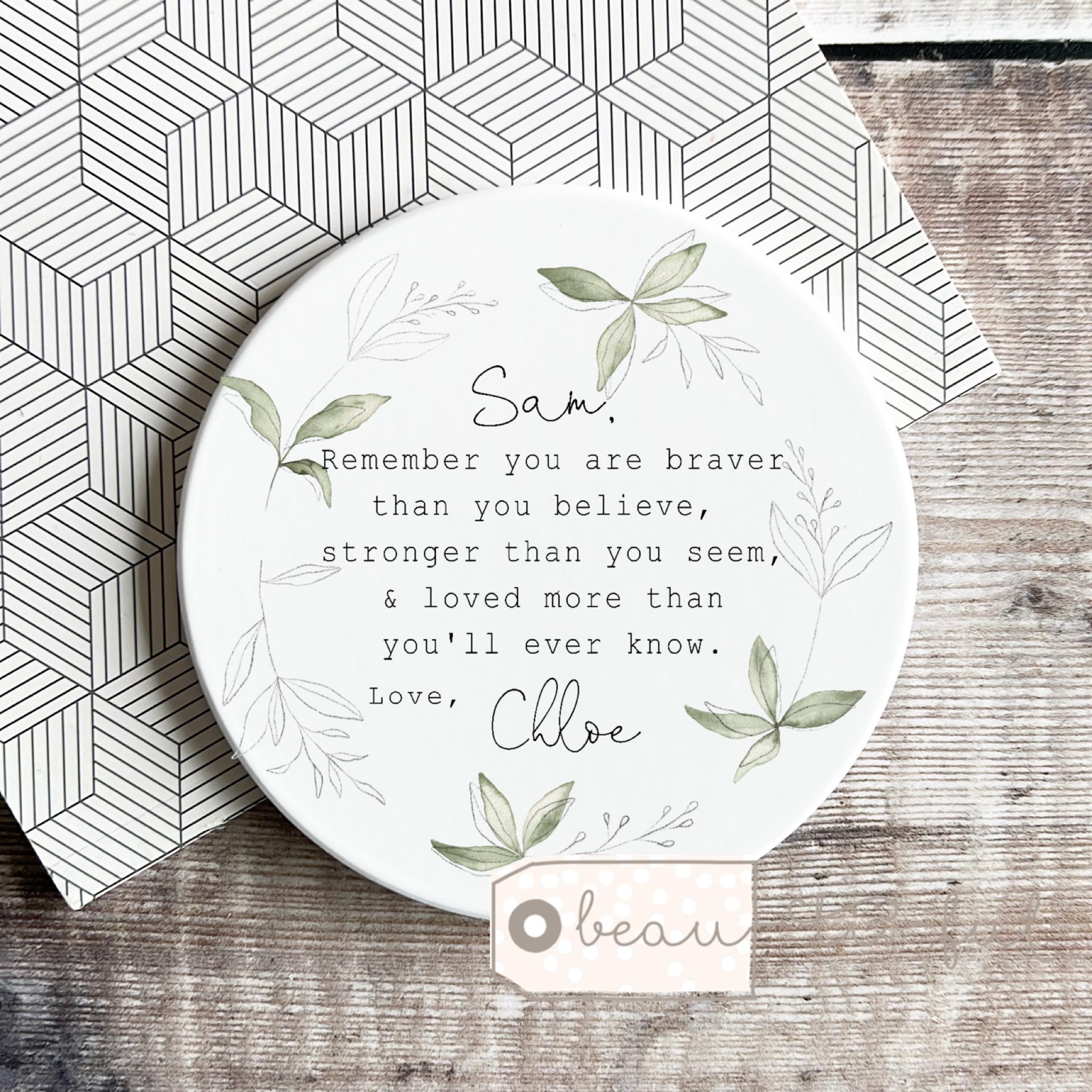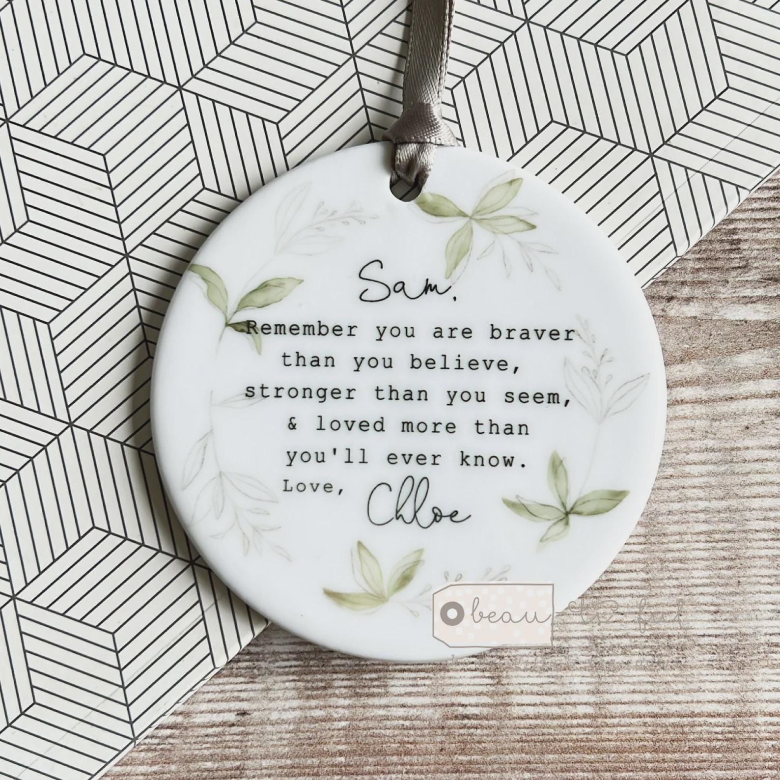 Heart design with quote on one side and name on the other side.