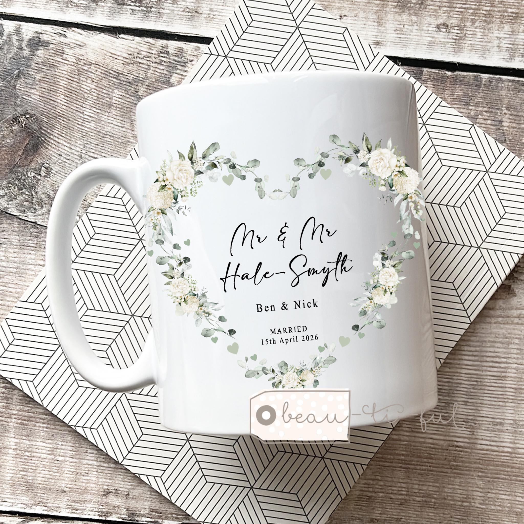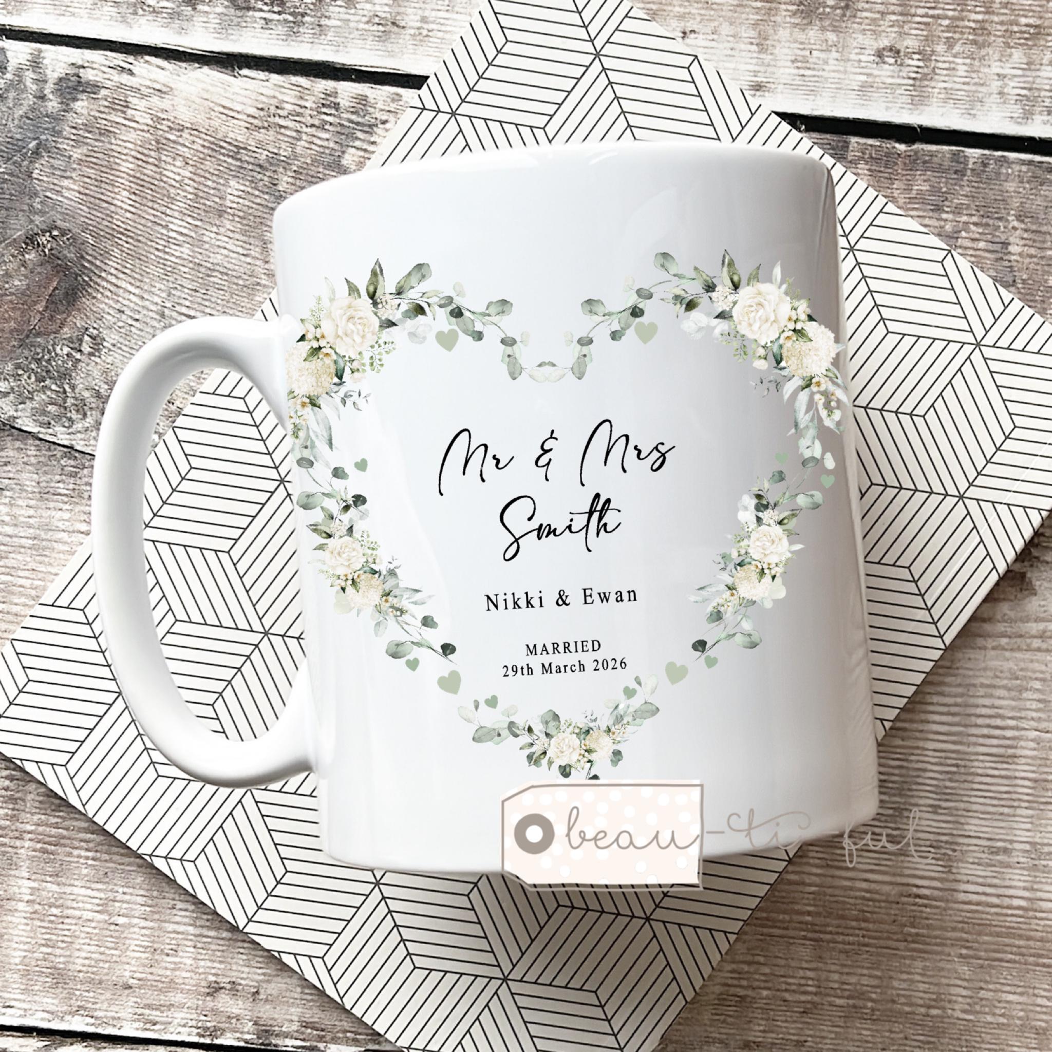 Personalised Wedding Mug gift, Mr Mrs, Bride Groom, Just Married Gift, Greenery Wreath, Gift for couple