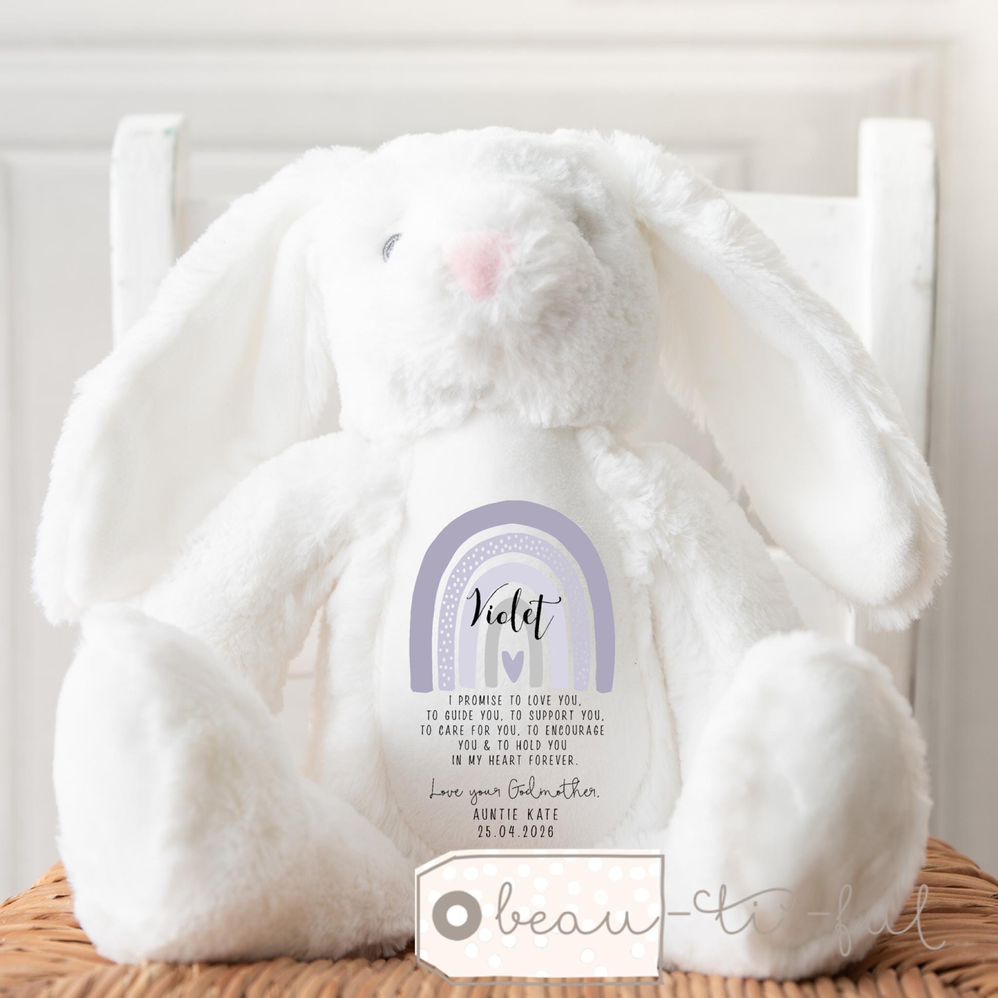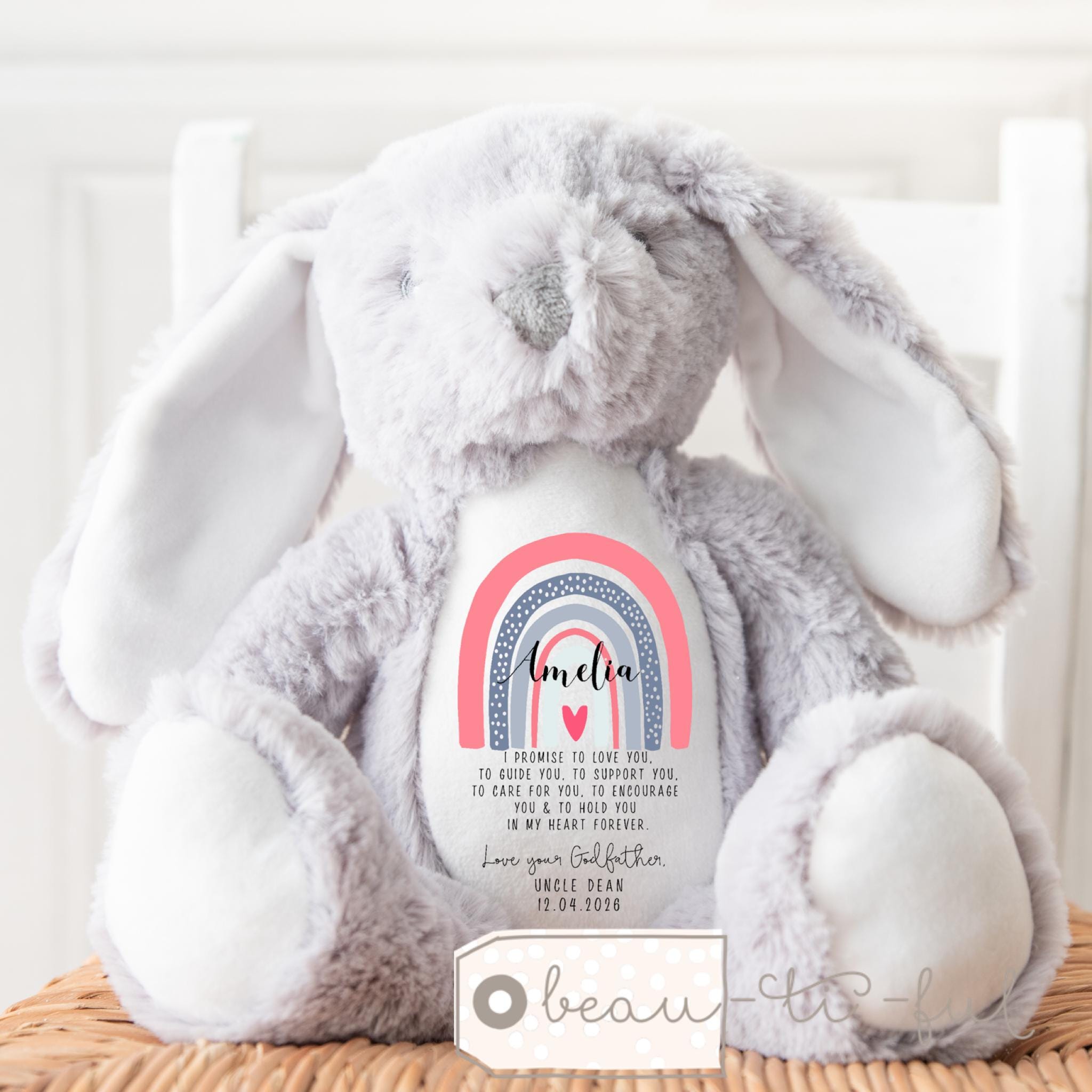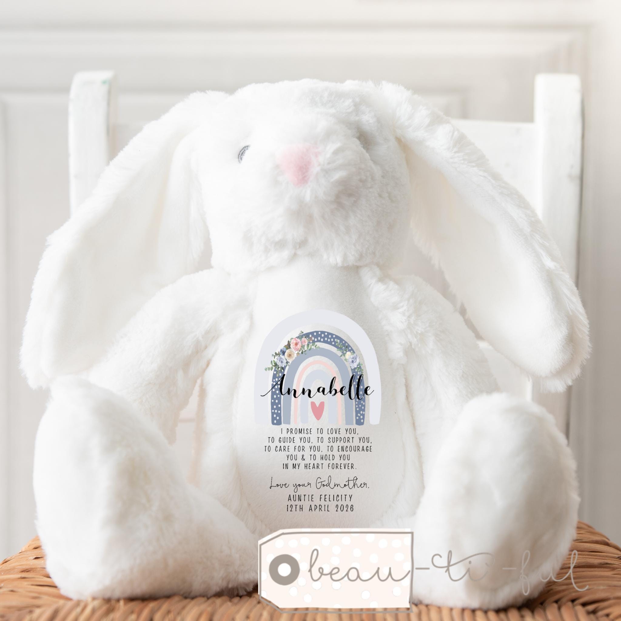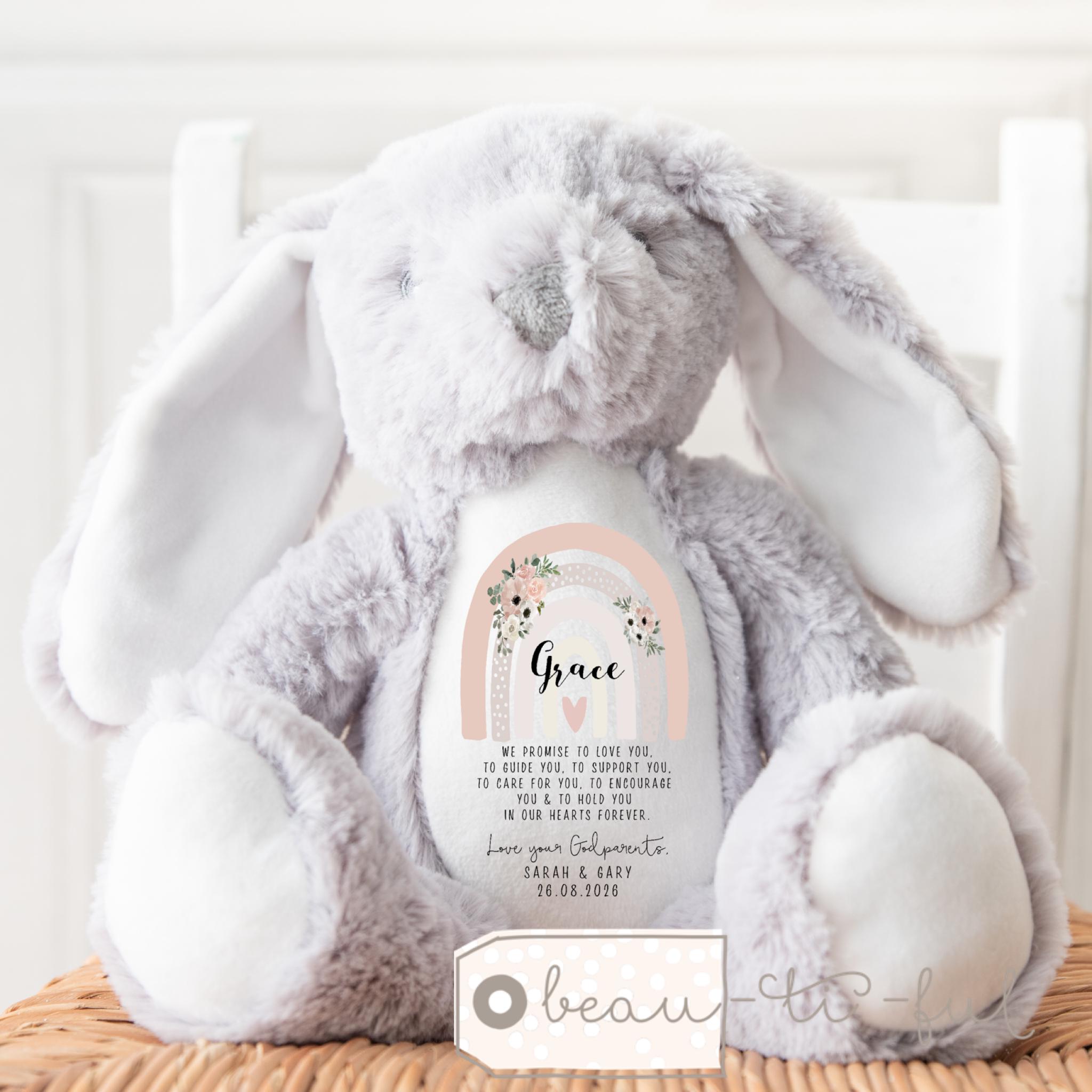 Personalised Christening Gift for Girls, Baptism Gift, Christening Bunny, Christening Gifts, Christening Keepsake, Girls and Boys Teddy, Bunny, Gift for nephew, Gift for niece, Christening toys, Christening gift for boys, boys christening keepsake, rainbow flowers, rainbow gift